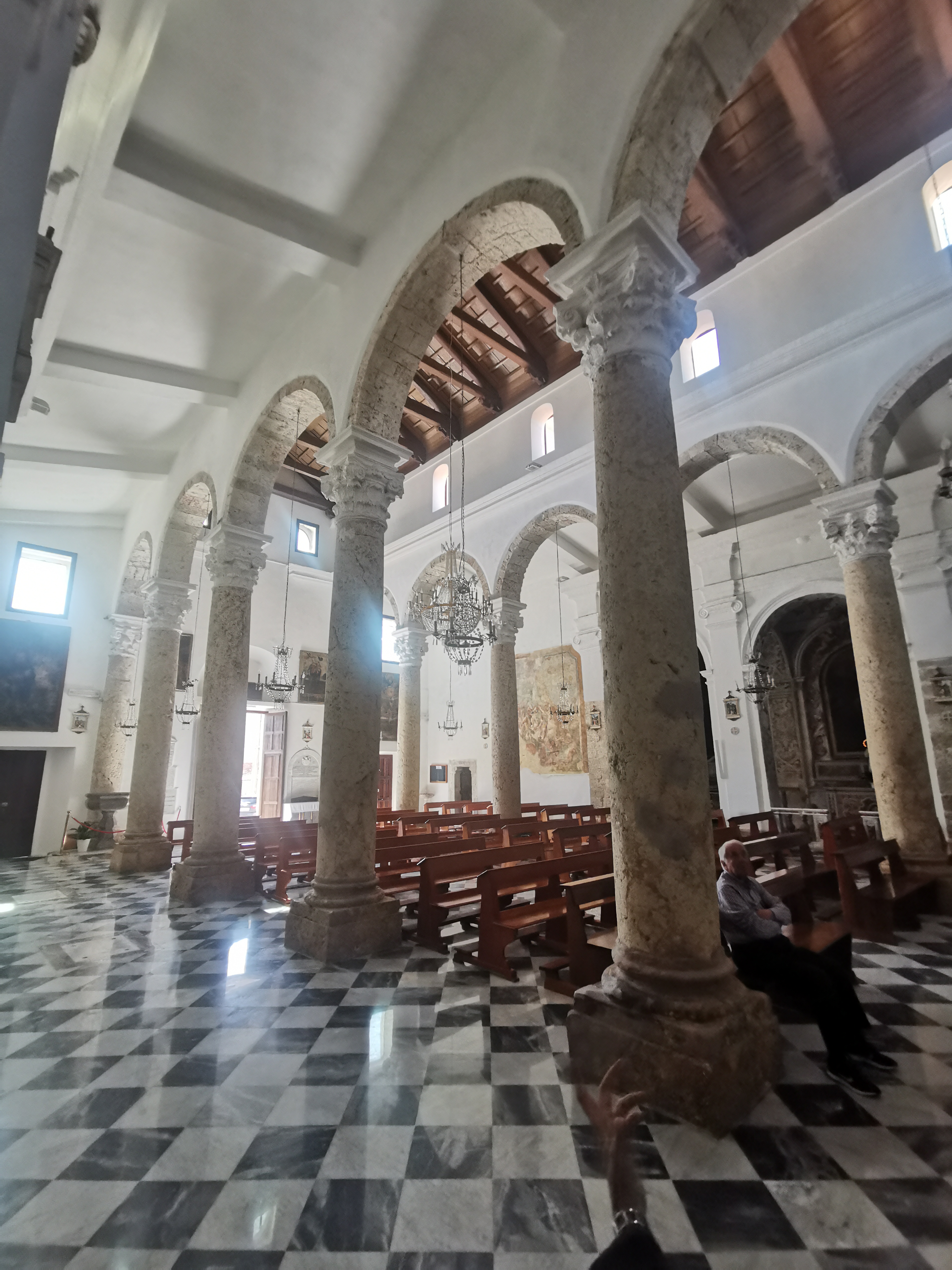 La chiesa sorge nella parte più alta del paese, sul ciglio di un costone in posizione dominante sulla piana di Milazzo. Non si hanno notizie su un preesistente impianto di origine medievale. L’edificio attuale può essere considerato il risultato di radicali interventi di rifacimento a partire dalla precedente fabbrica quattrocentesca di cui restano tenui tracce. Verosimilmente, dall’inizio del Cinquecento, con la baronia dei Valdina, si avvia il rinnovamento complessivo della struttura e lentamente, nel corso del secolo, la sua trasformazione in forme rinascimentali. La data del 1572 sopra la porta della torre campanaria, attestante forse il completamento della sua edificazione, potrebbe indicare la conclusione di lavori attuati negli anni di AndreaValdina Crisafi senior (1557-1577),seppellito all’interno dell’edificio.La chiesa diviene luogo di sepoltura privilegiato dei Valdina i cui tumuli si trovano nelle testate del transetto e nelle cappelle orientali. Presumibilmente con la Controriforma ulteriori modifiche (XVI-XVII secolo) interessano l’area del presbiterio e delle absidirispettivamente trasformate in coro (cappellone) e cappelle laterali.È probabile che un programma di riconfigurazione organico sia da ascrivere ai primi decenni del XVII secolo con Pietro Valdina (nominato marchese nel 1623). La chiesa ha un impianto basilicale trinavato, su colonne e archi a tutto sesto, cappelle laterali e ampio transetto, ma conserva all’ingresso delle cappelle orientali archi acuti forse riferibili alla chiesa quattrocentesca o di primo Cinquecento, insieme ad altri frammenti superstiti. Successivi interventi (aggiunte, integrazioni, ammodernamenti, ridecorazioni) datano tra fine XVII e XIX secolo; rimaneggiamenti e ripristini sono conseguenti ai terremoti (1783,1908) e ai restauri più recenti.