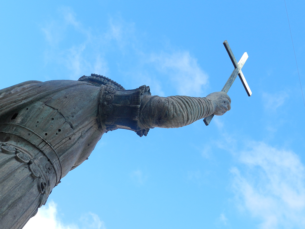 It is a bronze statue reintegrated in some of the missing parts in different periods. The sources tell of a first restoration in 1491, when the right hand and the cross were reconstructed.