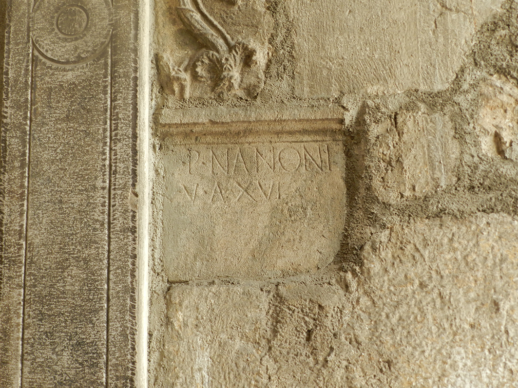 On the outside it presents numerous reused elements, including two inscription fragments and a column in Egyptian red granite with a picture of the Corinthian capital, many of which probably come from the bell tower, which collapsed in the 1857 earthquake.